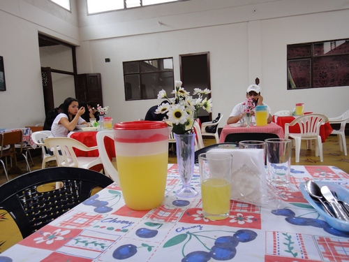 où elle est installée un restaurant très mignon super propre, où mangent des familles, des étudiants, des gens qui travaillent, pour moins de 2 euros ( à vérifier, il faut que j’aille voir le taux de change) elle mange une délicieuse soupe, du poulet, des pois chiches, des pommes de terre, du riz, des pois chiches, salade carotte choux céleri, le légume qui ressemble à une grosse racine (qui va enfin me dire ce que c’est ?) et du jus d’ananas frais à volonté, trop bon.