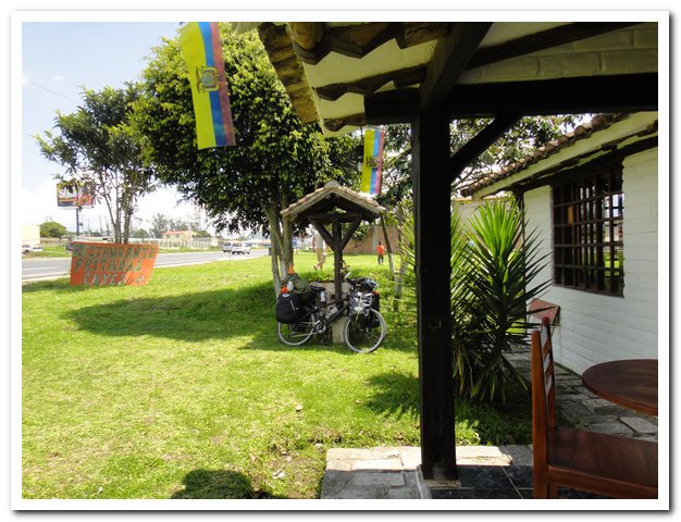 Arrive 12h30, j’ai faim, un super mignon resto me tend les bras, je vais avoir une discussion politique avec un équatorien, je vais discuter avec un expatrié-colombien qui fait ses études ici car en Colombie il faut payer… Je mange soupe et riz, bois un super jus de fruit et une limonade faite maison que l’on m’offre. (Jean-Luc, j’ai demandé, si j’avais voulu je pouvais mettre ma tente sur la pelouse, même derrière pour ne pas entendre le bruit de la route, retiens un resto mignon avec un puits sur la route d’Ibarra à Otavalo (la Panam).