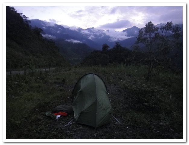 Impossible de planter la tente ici, quand au hamac et pitons, impossible la montagne part en morceaux… Je sens que je vais devoir pédaler de nuit ce dont j’ai horreur. Enfin je vois une maison, mais il n’y a pas de chemin pour y accéder et elle est en haut de la montagne. Plus loin je vois une autre maison, une jeune femme au visage triste allaite le dernier de ses six ou huit enfants, après avoir accepté que je plante ma tente, elle me dit qu’il faut que j’attende sept heures que la duegna soit là et donne son autorisation, ici comme en Colombie l’esclavage n’est pas tout à fait aboli. Elle m’envoie à une maison plus loin qui n’est pas tout à fait terminée et fermée et pas de terrain autour pour planter ma tente, je n’ai pas envie de m’installer dans les gravats. La jeune femme triste me dit que la duegne est au village voisin, c’est faux, il n’y a pas de village voisin…