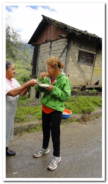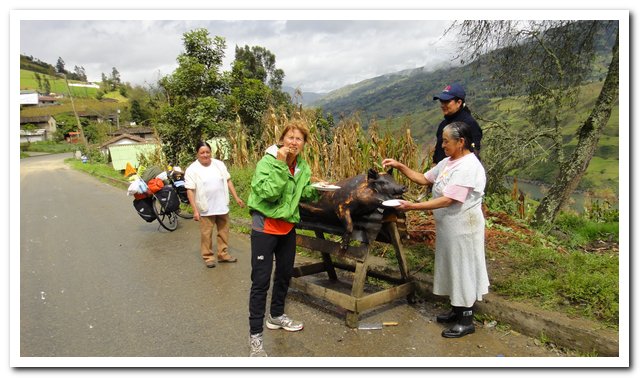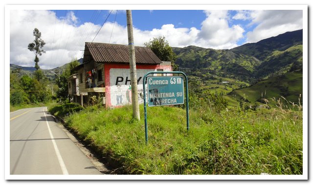 - Je finis par trouver une épicerie, je fais mes provisions pour ce soir et demain, on me propose de planter ma tente là, mais je voudrais monter le col cet après-midi, je me sens en forme et je ne voudrais pas arriver trop tard à Cuenca, je rate une rencontre mais en aurait une autre super belle. Je monte donc mon col (à près de 3000 quand même, oué pas de problème, Ushuaïa, tout droit, ça descend jusqu’à la mer…)