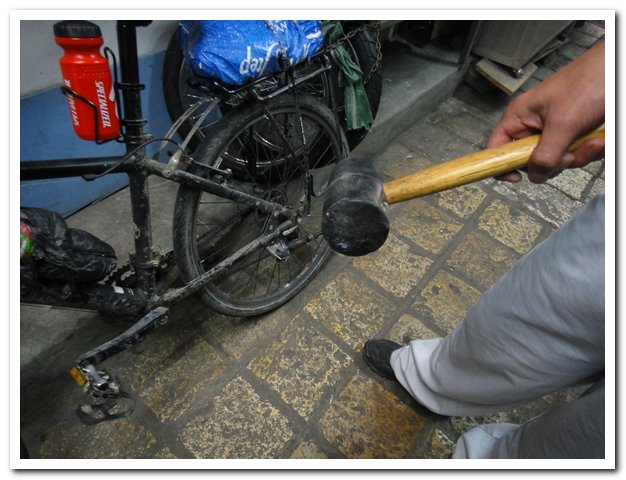 • Arranger ma béquille, je finis par trouver un magasin de pièces de rechange, ils me montent une nouvelle béquille qui va coincer le cable du dérailleur, lequel est endommagé et les futurs intervenants ne feront qu’aggraver la situation…
