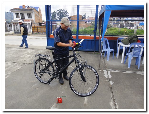 En attendant je suis embêtée par ce dérailleur. Je rencontre deux boutiques de réparations de bicyclettes, elles n’assurent pas le nettoyage et franchement ne m’inspirent pas confiance. Je cherche longtemps une station de lavage voitures, même les stations services sont rares, et elles n’assurent pas le lavage. D’ailleurs voitures, camions et bus sont boueux, en Colombie même dans le coin le plus retiré de la montagne on trouvait des stations de lavage de voitures. d’ailleurs en Colombie on trouvait de tout, ici on trouve rien… En Colombie ils conduisent très mal mais lavent leur véhicule tous les jours… En Colombie il y avait des petits commerces partout, ici rien. En Colombie le moindre petit village avait son ou ses hôtels, ici rien. je vous énerve avec ma Colombie ? Bon, allez je suis réconciliée avec L’Equateur, il y a eu le volcan Imbabura, le Tunguruahua, la blancheur du Cotopaxi et du Chimborazo, l’Amazonie enchantée et l’échappée belle, et là surprise, surprise… Dans cette banlieue sinistre de Cuenca on finit par m’indiquer una lavadoria en dehors de la Panam, pour une fois les renseignements sont justes, le jeune qui s’occupe de mon vélo trouve la panne, le cable du dérailleur coince sur la nouvelle béquille et est même abîmé. Il m’arrange ça avec mes outils, je n’ai pas la clef nécessaire pour enlever cette béquille qui d’ailleurs ne tient rien une fois le vélo chargé.