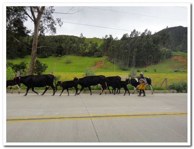 La température est fraiche, il ne va pleuvoir que de 12 à 13 heures et pas trop fort. Je crois bien que durant une demi-minute j’ai eu un rayon de soleil… Je trouve un petit resto, je mange très bien pour un dollar 50. Et puis, surprise, la route se met à monter, monter, monter, même que des fois je dois pousser, les vaches remplacent les voitures.