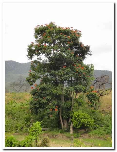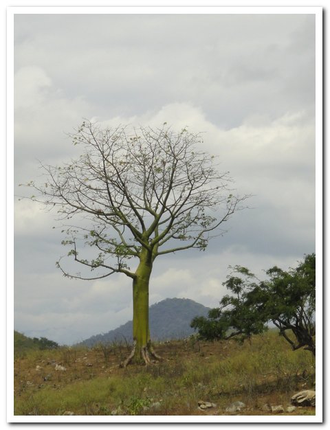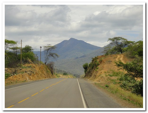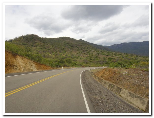 Je revis un enchantement, la route est superbe et quasi déserte (au passage je suis sur la Panam, je vais y rester tant que je m’y sens bien et aussi il faut que je trouve une carte), le paysage d’enfer, la route va serpenter entre les montagnes puis rapidement devenir longue ligne droite qui monte et qui descend, la température à 37 sous le soleil m’est très favorable, elle chutera à 32 sous les nuages pour atteindre 28 en fin d’après-midi. Deux nouveaux ennemis apparaissent des mini-guêpes qui se collent sur moi dés que je tente de m’arrêter (et ce malgré la prise de vitamine B, la vitamine B dans la crème solaire et la crème repellente, du coup je m’arrête peu… Lle paysage se fait presque désertique, les maison maisons rares et les villages quasi absents, la végétation est presque exclusivement faite de résineux… Je crois voir des baobas…