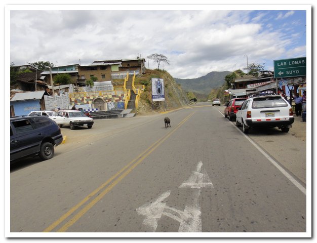 La meilleure surprise du jour (meilleure encore que la bonne route et le paysage et la chaleur) ce sont : les sourires, les encouragements, les appels de phare et les klaxons gentils, les saluts de la main, je me crois presque de retour au Vénézuela et mon moral remonte en flèche. Les enfants aussi sont plus souriants et les chiens moins méchants, un va me courser dans une montée et abandonnera vite, trois me courseront plus violemment, l’automobiliste qui arrive en face les chassera à grands coups d klaxon…Je vois un bus, un seul, mais un quand même, que dans un sens, mais si j’en vois un c’est qu’il y en a, je pense à un éventuel retour à Cuenca… Je me suis arrêtée comme ça dans un rare village pour demander un peu comment c’était après et pour tester un peu et tout de suite j’ai senti la différence d’accueil, il y a des choses qui se sentent rien que d’un mot, d’un geste ou même d’un regard. Passé deux heures de l’après-midi je me dis qu’il faut que je m’arrête et que je mange et ce malgré le guêpes. Je me pose à la sortie d’un village, assise dans le fossé, de très jeunes filles passent et pouffent de rire à ma vue ( au passage elle pouffent de rire pour rien comme toutes les très jeunes filles du monde), je leur demande si c’est de voir une abuela pédaler qui les fait tant rire, bon les abuela ça mangent aussi, la glace est rompue, on rie. Arrive des mamans et leurs enfants puis de jeunes garçons, on parle, je réponds à leurs questions et en pose encore plus. L’orage, non il ne va pas tomber, juste en janvier et février, elles savent pas les dames que je suis une catastrophe ambulante ( je rappelle à ceux qui prennent la lecture en cours de route que plus catastrophe ambulante que moi y a juste un exemplaire, c’est mon petit-frère), que sur mon passage tombe les pluies torrentielles du siècle, que les volcans se réveillent, que la foule s’agite, que je suis même capable de faire tomber la pluie dans le désert le plus aride du monde (attendez le désert d’Atacama, vous allez voir…), d’ailleurs ce soir dans cette région sèche où il n’a pas plu depuis 4 mois, et bien croyez-moi si vous voulez mais il a plu… Et quand je suis allé en Syrie, sur mon passage le désert s’est recouvert d’herbe tendre… Oui, oui c’est vrai… Quand même je me sens rassurée sur l’absence d’orage car ça je  n’aime pas du tout, mais alors pas du tout. Je montre mes jambes transpercées, c’est pas le transperçage habituel, il n’y a pas le rond blanc, ce n’est pas non plus des piqûres de moustiques, je pense que ce sont les mini-guêpes, on me confirme ce sont des « turulas », dangereux ? Non. Ca transporte pas des maladies ? Non. Eux-aussi se font piquer ? Oui. Ouf là y a pas que moi qui est visée…Et les chiens ? Non ils n’attaquent pas. Je dois faire quoi ? Les ignorer ou avoir une pierre. Bon il vaut mieux avoir une pierre… Quand même on est au Pérou mais il faut pas trop rêver. Je leur dis le bonheur que j’ai à les rencontrer, je leur dis le bien que me font leurs sourires… Une fois avalés mes ships (les avant-dernières car ce soir je n’en ai pas trouvées) ma brioche, ma dulce del leche pas terrible, oui il y en a de meilleures que d’autres et mon eau je repars. Mon objectif était Le Pérou, mais comme mes jambes tournent bien, que la route est roulante, que je suis à basse altitude et même si je ne ressens aucun effet de l’altitude je vois bien que le rendement est différent quand on redescend et que tous les globules rouges accumulés s’agitent… Je me fixe un objectif de 50 km, ce qui va correspondre à une  arrivée vers16 heures et à partir de là je cherche un endroit sécurisé où dormir. Je pensais bivouaquer dans un hameau, mais voilà une petite ville avec hôtel, j’y vais, les bivouacs au bord d’une route déserte c’est pas forcement top top. Voilà les gens de l’hôtel encore en construction sont super sympas, la douche froide est plus supportable à 27° qu’à 15°, dans la petite ville il y a plus de boutiques internet que de boutiques d’alimentation, les besoins changent, bref c’est le paradis…