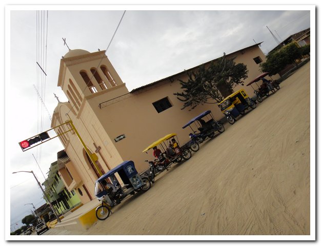 et arriver à la petite ville de Las Lomas, ville tout ensablée, pauvre, avec de drôles de taxi style moto-carosse ou pousse-pousse motorisé…