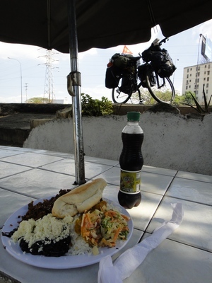 Pour atteindre mon autoroute je dois d’abord remonter à contresens une autre autoroute sur un kilomètre ( je le fais à pied), puis traverser le deux fois deux voies, j’évite le terre plein central en traversant une voie de sortie, la circulation est intense, je dois courir. Puis surprise il y a une voie d’arrêt d’urgence qui même si elle est étroite, même si parfois elle rétrécit encore, voire disparaît, même si elle est parfois semée d’embûches me protégera des camions tueurs. Il y en aura quand même trois ou quatre qui essaieront de me déstabiliser. Le trafic est peut-être un peu moins dense, ou je m’habitue, ou cette voie d’arrêt d’urgence (qui sert quand même à tout,: urgence mais aussi arrêts en tous genres, achats de sac de maïs, haricots ou objets en aluminium, et voie royale pour cyclo en perdition…). La route commence par un long faux plat montant de 10 km qui de sera de plus en plus faux et de moins en moins plat et de plus en plus montant), j’en viendra quand même à bout sans mettre pied à terre, puis ce sera une succession de faux plats montants et de faux plats descendants. On m’a dit qu’ Baraquisemito était à une cinquantaine de kilomètres, moi sur ma carte j’évalue plutôt la distance à 70 km. J’ai décidé de tracer, je trace. Vers 11heures je m’arrête dans une station service, je réussis à manger un autre quart de mon palmier et à boire un coca en entier. Je satisfais de bonne grâce à la curiosité locale, m’enquiers aussi de ce que les gens font sur la route, une dame d’un certain âge ( le mien) me dit qu’elle va à Merida parce qu’il y a fait moins chaud. Nombreux sont ceux qui me demande non pas un autographe mais mon adresse email et me donnent la leur. Mon indienne a eu une bonne idée de me conseiller d’écrire sur mon drapeau « cuidado abuela », cette enseigne m’ouvre de nombreuse portes, et peut-être aussi que je suis en bicyclette et que je suis femme et que je suis seule. J’ai un tas de numéros à appeler en cas d’urgence, sauf que… je n’ai pas de téléphone…Chacun y va de son conseil sur l’itinéraire à suivre, tous veulent me faire éviter la montagne, à chaque fois je réexplique que je veux la montagne, ce que je ne veux pas, ce sont les camions tueurs…Arrive la bifurcation pour Maracaibo et Trujillo pour les poids lourds, j’ai maintenant l’impression qu’il y a plus de voitures que de camions. La route ne sera que faux plats montants ou descendants. A un moment donné j’aperçois au loin les contreforts de la Cordillera Andina, je suis contente, enfin… Puis ils vont disparaître dans les nuages. Je continue à me forcer à boire, à savourer la sécurité de cette voie d’arrêt d’urgence. Les contrôle de police se passent sans qu’ils m’arrêtent. Les péages continuent à être gratuits, le soleil à taper, j’ai définitivement opté pour l’espèce de sous-pull doux à manches longues dont je remonte les manches et qui protège mon dos. Je crème le reste régulièrement. Il n’y a plus de moustiques, sauf en général un seul le matin qui me donnera j’en suis sûre la dingue. Les cinq derniers kilomètres sont difficiles, montants, et je suis toujours malade, un peu moins qu’hier. A un moment donné un camion est arrêté, bouchant la vue sur une voie d’entrée, par sécurité je mets pied à terre, traverserai la voie en courant, et bien sûr ne pourrais réenfourcher mon vélo, vu que ça monte, mais qu’importe je pousse (ça me repose un peu), les camions sont poussifs, l’ordre des choses est respecté. Je finis par arriver à Barquisimeto qui est une ville qui doit s’étendre sur plus de 10km de long, je choisis de rester sur la voie rapide plutôt que sur la contre-allée, c’est moin dangereux, il y a moins d’arrêts subits de bus ou voitures, moins de changements impromptus de véhicules. Je sortirai quand même de cette voie pou prendre une photo de la cathédrale à l’architecture inattendue ( pour moi petite française). Ca et là sur la route de monumentales statues de vierge, j’aurais encore droit à un feu de broussailles, pas de photos, c’est trop dangereux, les cendres et es flammèches volent jusque sur la route. J’ai l’impression que jamais n’atteindrai le centre, enfin une flèche à gauche, el centro. Un premier hôtel, pas d’internet, vu que maintenant j’ai des bolivares, j’ai décidé de me payer un hôtel un peu plus cher mais avec connexion wifi, on m’en indique un, sauf que la réceptionniste m’explique qu’il faut configurer mon compustador, elle rentre dans mon disque dur, oh la la que je n’aime pas ça, je surveille de près les opérations et finalement ça ne marche pas, mon windows7 n’est pas compatible avec celui de l’hôtel, je reste quand même dubitative sur ce diagnostic, bon je vais essayer le cybercafé.