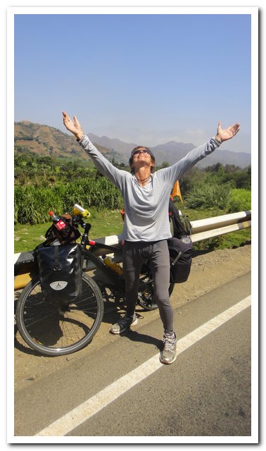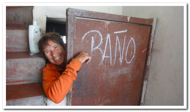 Allez on recharge le vélo et on repart ensemble, nos coups de pédales s’accordent bien et on se fait plaisir, de temps en temps Lucho me pousse un peu, nous arrivons à Sharan, nous avons roulé vite, le soleil a a fait son apparition, cela fait un moment que nous avons quitté les polaires et transpiré un max, mais moi ça me va, la chaleur m’est vraiment favorable, nous avons monté près de 600 mètres, nous déjeunons, je décide de ne pas aller plus loin, Lucho s’enquiert d’un hôtel pour moi, la propriétaire du petit restaurant dans ce petit village de 20 maisons propose une chambre, c’est la chambre de sa fille, moi elle me plait, vue d’enfer sur la montagne. La salle de bains est un peu spéciale, là la porte est fermée…