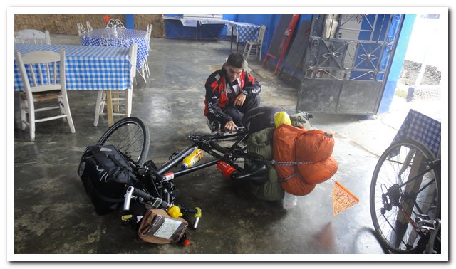 Lui il est colombien, quand même j’ai un peu honte, mais il a un niveau vachetement supérieur au mien, il a au moins 100 kg de bagages avec pas les œuvres complètes de Balzac ou Victor Hugo, mais pas loin… Et un dictionnaire des synonymes, en espagnol… La Colombie me poursuit… Les cyclotouristes du monde entier sont à mon image, des êtres étranges, chacun dans leur genre, tous intéressants, certains très attachants… Oscar il est attachant oui mais faire sonner son réveil à 5h30 pour se lever à 6h30 ça te détache vite… Ah oui, j’avais oublié, en Colombie c’est l’heure du réveil normal…
