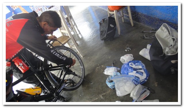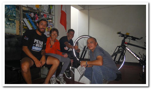 Lucho décide de changer tous les rayons qu’il m’a mis ne venant pas de l’ancienne bicyclette et d’en mettre de plus solides, l’opération va prendre longtemps car après il réajuste au millimètre près l’ensemble de la roue, au passage il me montre comment enlever la cassette de je sais plus comment ça s’appelle à l’arrière, et comment remonter, me donne (me vend) les outils nécessaires, je vidéote le tout, mais j’ai retenu, tout cela prend du temps et se termine le soir, il veut pas que je prenne le bus à cette heure là, pour moi c’est pas un problème, mais bon je prends le taxi ou plus exactement la voiture de quelqu’un que Lucho connait. Ici les affaires se font toutes comme ça, par réseau. Mon téléphone c’est le mec de l’internet imprimeur pour ma carte (routière, pas bancaire, je fais gaffe quand même), qui fait aussi agence de voyages qui m’a mis en contact avec quelqu’un et apparemment ça marche (pas que le commerce mais mon téléphone…)