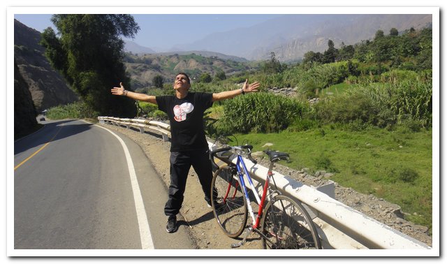 Nous allons bientôt traverser la zone dangereuse : une longue ligne droite au milieu de champs de canne à sucre tenue par deux villages sur les flans de la montagne. Lucho me pousse avec sa main, le mieux est de traverser le plus vite possible, j’appuie sur les pédales un max… Ouf la zone dangereuse est traversée…