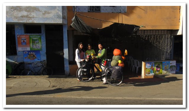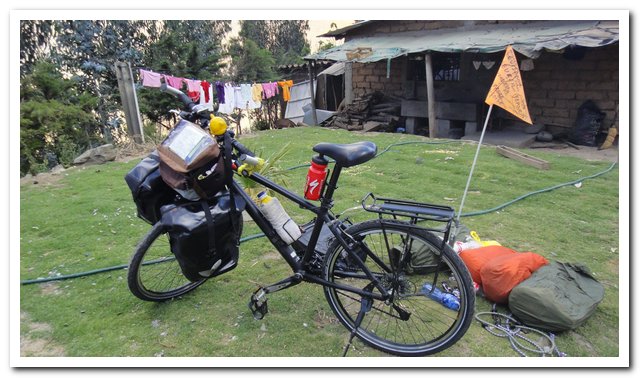 - Voilà cette famille m’accueille chez elle, ils font aussi épicerie, je refais le plein d’eau, de coca, de pain, de papier toilette, j’achète aussi des allumettes, je n’ai pas l’intention de cuisiner mais maintenant j’ai du gaz et ça peut servir pour recharger mon truc à chaleur pour les mains. Je vois des œufs, je demande si je peux commander deux œufs durs pour le lendemain, oui c’est possible. Le soir je mange à la table familiale, je suis invitée, je ne paierai pas, elle me propose aussi une chambre, mais je suis bien dans ma tente et la rassure sur le fait que je n’aurai pas froid. Il y a trois enfants, Stéphanie 9 ans, Mélanie 4 ans et Franco deux ans, le père est plus effacé, la mère s’appelle Esmaralda. La petite Stéphanie a une intelligence vive et l’oreille parfaite, c’est impressionnant cette petite répète tout ce que je dis en français parfaitement sans accent et du premier coup, c’est vraiment impressionnant, je dis aux parents qu’elle devrait faire de la musique et étudier les langues étrangères, ici pas d’électricité mais l’eau qui vient de la montagne et un groupe électrogène loin, donc pas de bruit, pas de télévision, pas de réseau non plus, mais une école pas loin…