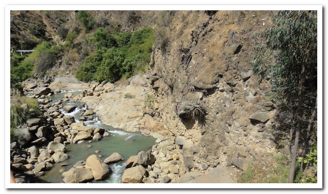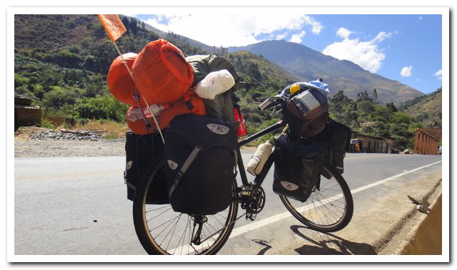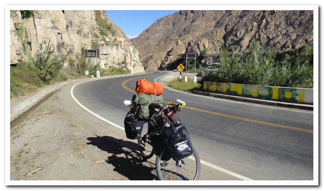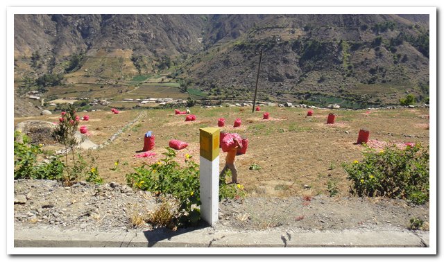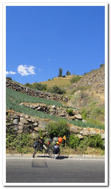 Je n’ai plus qu’un objectif, sortir de cette montagne avant la nuit et aussi avant que les camions ne reviennent. Oui cette route a la particularité d’être déserte dans la journée et d’être un défilé ininterrompu de camions à partir de17 heures 30, 18 heures, je me vois mal dans cette route de montagne perdue au milieu des camions… A 15 heures commence le défilé des bus avec les camionnettes qui doublent et qui ne font aucun cas de moi et moi je suis nase de chez nase, je vais pousser. Pendant une heure je pousse bien, mais après je faiblis, oh la la, je sens que je me prépare une galère d’enfer. Arrive trois maisons, il y a aussi trois personnes à coté, je demande l’hospitalité, ils ne sont pas chez eux, je ne peux planter ma tente à coté, le terrain est trop pentu et je vais finir dans le précipice, ils m’expliquent que si je m’installe chez les gens je vais me faire virer, bon je prends pas le risque, ils me disent que plus loin il y a un endroit plat avec des maisons, j’espère qu’il dit vrai car je pousse, je m’arrête, je pousse, là c’est dur.