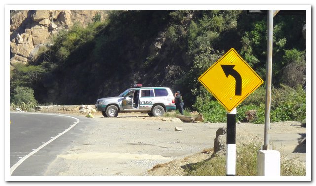 Ce matin à 8 heures ils étaient là, et voilà, ils m’escortent, je n’aime pas vraiment ça, je ne vais quand même pas traverser tout le Pérou sous escorte policière. Au début ça m’amuse je regarde combien de mètres ils laissent entre eux et moi, ils laissent 500 mètres, ça va… Oui mais les 500 mètres c’est dans la ligne droite car après dans les virages ils me gardent toujours en ligne de mire, devant, derrière…