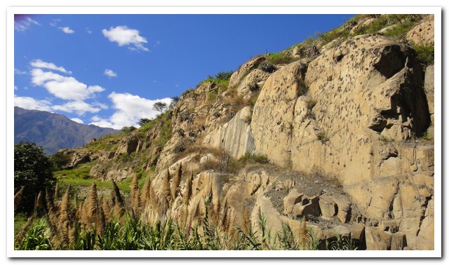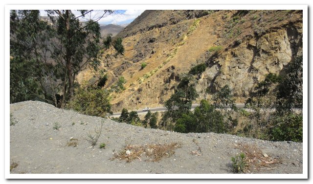 - Mais c’est dur de chez dur, oui je vais souffrir, d’abord je vais au-dessus de ma vitesse avec l’escorte policière… Je vais quand même me faire presque 1500 mètres de dénivelée, ce qui pour une reprise est bien trop… A mon premier pique-nique, soit vers les 10 km, je sens mes jambes très très limites, elles tremblent, je sens qu’une chiquenaude me mettrait par terre et qu’il me faudrait de 3 à 7 jours pour repouvoir marcher. J’hésite à manger assise au bord du fossé car ce fossé peut haut (50cm) il va falloir que le remonte, j’y vais très précautionneusement, je sais qu’un mouvement brusque peut me paralyser, ça passe, je mange ships pain galettes au chocolat, je termine le coca, n’en ai pas pris assez. Je me dis que je vais avoir du mal à rallier Otuzco… La route ne va que monter… Je me dis que j’ai vraiment bien fait de n’être pas partie la veille après m’être couchée à des points d’heure… J’en veux à la terre entière, d’abord le sort qui m’a donné cette maladie, les voleurs, la banque, le marchand de vélo, oué tous ceux qui ont fait que j’ai du m’arrêter onze jours, je sais que pour moi cinq c’est le maximum, une semaine ça peut passer, au-delà c’est la cata… J’essaie de gérer cela au mieux (les muscles et aussi la haine…) et profite un max du paysage, de l’excellente route presque déserte, du beau temps, de mon vélo qui tourne, et de mes jambes qui tournent quand même…Arrive le kilomètre 20, je repiquenique, reproblème du fossé, suis extrèmement prudente, pas de mouvement brusque, la chaleur de l’espèce de pont en ciment du fossé fait du bien à mes jambes, je me force à manger, je n’ai pas faim, je suis épuisée de chez épuisée, je n’ai pas assez de coca mais j’ai de l’eau en quantité suffisante. En quittant mon deuxième pique-nique je perds une bouteille vide, je dis à l’homme devant sa maison que c’est pour la poubelle, que ce n’est pas bien de la laisser dans la rue mais si je m’arrête je repars plus il la ramassera et m’assurera qu’il va la mettre à la poubelle, l’avantage de monter lentement c’est que je peux discuter avec les gens… Je n’ai ni problème respiratoire ni cardiaque et ma maladie musculaire m’empêchant de trop forcer et m’otant presque toute graisse protège mon cœur… Faut quand même bien que j’ai des petits avantages… J’interroge ( tout en pédalant, je vais vraiment pas vite…) l’hoome qui a ramassé ma bouteille sur la distance qu’il me reste à faire pour rejoindre Otuzco, horreur c’est à 18km, moi je pensais qu’il m’en restait 10, je peux pas faire 18km de montée dans l’état où je suis… L’homme me dit que la route monte un peu et qu’après c’est plus plat… En fait de monter un peu, je monte encore 500 mètres…