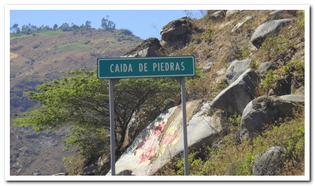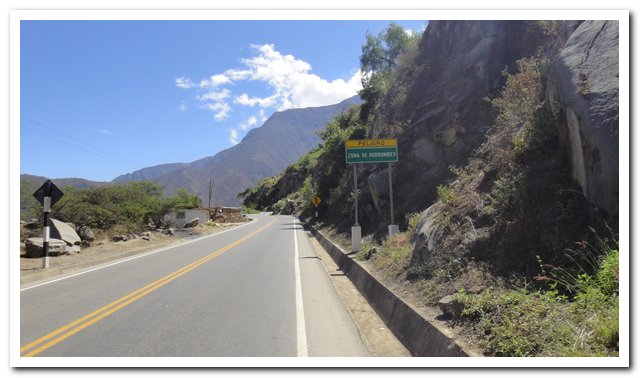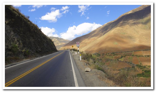 Le temps va être super, pourtant ce matin il y avait des nuages, ce que l’on appelle chez nous les cumulus de beau temps, mais ici tout est tellement différent… Ici soir et matin il fait frais et les nuits sont froides… Mais dés le départ je me découvre et garde quand même mon collant… L’escorte policière ne me permet pas de faire ce que je veux, j’ai tellement peur qu’ils m’embarquent, je garde donc mon collant, je vais le regretter quand il fait chaud, je vais le savourer dans les petits coups de vent froid de la Cordillère et quand il va se mettre à faire très froid je suis super contente, car avant de me couvrir il faut que je trouve un endroit à peu près plat,où je risque pas trop de me faire accrocher par une voiture.