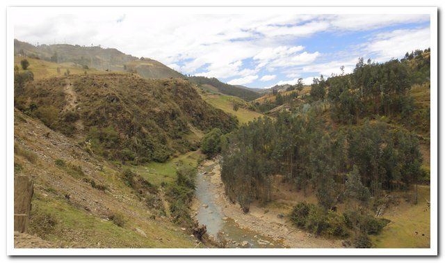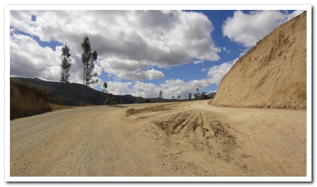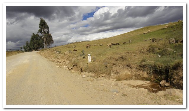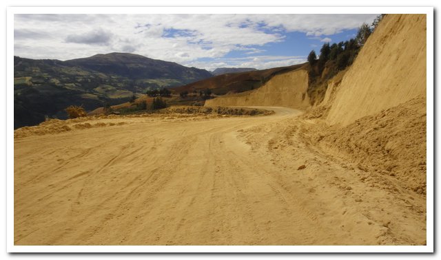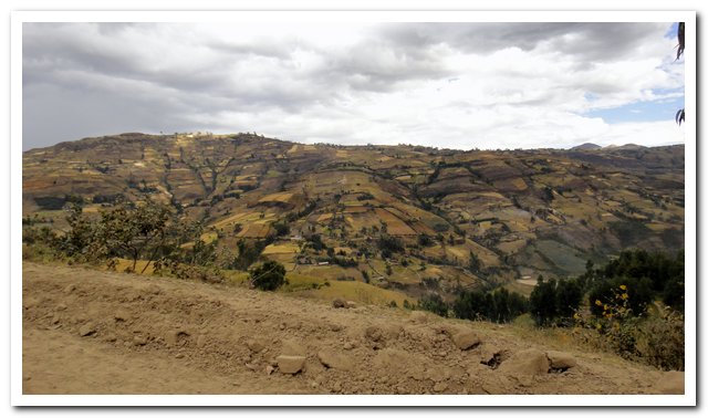 Petite parenthèse, j’écris dans ma tente, j’ai laissé mon sac poubelle dehors, il n’y a rien d’intéressant que le papier de mes crackers, j’entends une bête qui farfouille dedans, je n’ai même pas peur, je crois que je vais finir pas n’avoir plus peur de rien… J’espère quand même ne pas devenir dure et garder un cœur tendre… En plus des dérapages il y a la pente, dans un virage je galère un max, la pente à la vénézuelienne, les dérapages à la péruvienne, ça donne… Et pour couronner le tout il y a la poussière, la poussière du vent, la poussière quand passe une voiture , un camion ou une camionnette… Je suis même obligée à plusieurs reprises d’essuyer les lunettes… A un moment donné je doute, qu’est-ce que je suis venue faire dans cette galère ? Le paysage est un peu monotone, des montagnes cultivées, c’est le moment de la récolte, quelques rares villages. Et puis quand je doute je passe un col à 3000 mètres et là je ne doute plus ça me plait cette nature dure et impitoyable, et puis je vais continuer à monter et atteindre un altiplano à plus de 3200 mètres d’altitude et je suis contente.