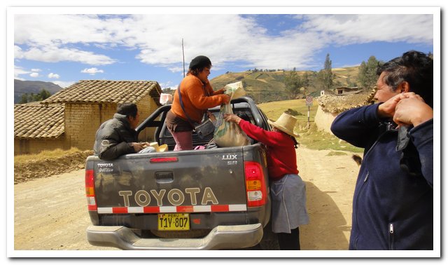 Bon les bêtises c’est pas fini, avec tout ça je suis perturbée… J’ai remarqué qu’ici il n’y a pas de rosée, que ma serviette a séché durant la nuit, donc pendant mes longs préparatifs je mets mon unique maillot bleu qui me protège du soleil sur l’étendage et je pars… Sans… Je ne m’en apercevrais que 5 km plus loin d’une route extrêmement difficile, impensable de rebrousser chemin en vélo, je laisse mon vélo sous la garde d’un vieux monsieur dans un tout petit village et je repars le chercher, je marche et fais du stop, oué sauf que les routes à moitié désertes c’est pas super pour le stop, un bus passe, me prend, je raconte mes aventures, je ne paie pas; l’homme qui seconde le chauffeur (parce que le chauffeur il est tout à sa route, la route est très très difficile) me dit que si je n’ai plus d’argent ici pas de problème, je demande et on me donnera, y a pas le Pérou, c’est le Pérou… Je passe au plan 2 bis de restriction budgétaire, je ne passerai plus jamais au plan 3, je mendierai mais plus question de me priver de nourriture, et là je sais que je peux non seulement faire appel au peuple mais aussi à la police. Je récupère mon maillot, je remarche, un camion passe et ne me prends pas, je remarche, plus longtemps qu’à l’aller, une camionnette passe et me prend, c’est assez l’horreur, je manque de valser par dessus bord, je me cramponne un max, je sais pas comment ils font les gens, je suis moins secouée sur mon vélo, je raconte mes aventures, une des dames me dit qu’un vélo comme moi vient de passer… Ce n’est pas mon vélo ? Non. Le temps de me cramponner pour me retourner, le dit vélo est nimbé du nuage de poussières… Je ne saurai jamais si c’est un autre fêlé comme moi… Une des vieilles qui étaient dans la camionnette habite là où j’ai laissé mon vélo, dans son sac, quatre bouteilles d’eau, deux de coca, elle me dit qu’elle vend aussi… Je ne peux rien lui acheter, le plan 2 bis de restriction budgétaire et le poids, j’ai honte, elle est dans la survie, moi aussi… Au passage c’était tellement acrobatique cette virée en camionnette sur cette route épouvantable que j’en ai failli oublier mon maillot dans la camionnette, je profite d’un moment sans personne pour le mettre ce fameux maillot bleu car là il fait chaud.