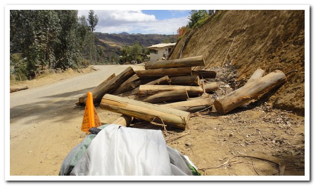 Je réfléchis, hier j’ai entendu un bruit bizarre, j’ai cru que c’était mes freins, j’ai d’abord pensé que le mauvais sort me poursuivait, c’est pas possible, là ce sont des freins neufs, et puis et puis j’ai quand même eu l’idée de regarder, il y avait un sac où je mets mes vêtements chauds disponibles, oué parce qu’ici c’est comme en Colombie, la température passe de 30 à 9 ° en deux minutes… Et moi je ne peux pas me permettre de me refroidir, il faut que je trouve un truc pour avoir mes vêtements à disposition et aussi trouver un bâton qui me serve de béquille car là je vais à la cata… Donc le sac de vêtements chauds avait glissé et touchait ma roue, juste j’ai été contente que pas de dégâts et j’ai pas pensé plus loin, erreur, erreur, erreur, car je pense que dans un plastique il y avait mon anorak, bin celui qui l’a trouvé il a eu un bon suerte comme moi avec mes zéros crevaisons, au fait mon webmaster change les kilomètres car selon mes calculs à moi j’ai dépassé les 6000… Donc j’ai perdu mon anorak et je n’ai plus beaucoup de soles (la monnaie du Pérou)… Je suis quand même un peu perturbée, je vais voir la police qui est en face de l’hôtel , je leur demande si on leur a pas rapporté mon anorak, là je crois encore au Pérou, je leur demande de me le rapporter si des fois ils le retrouvent, je crois toujours au Pérou… Tout cela prend du temps et moi qui voulais partir plus tôt je pars passé 9 heures… Me reste à manger mon bout de plastique (la carte bancaire) et à brûler mes dollars de réserve pour me réchauffer…