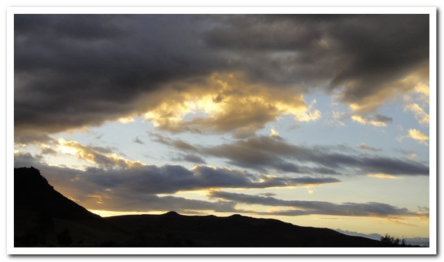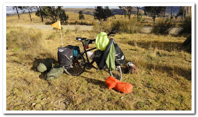 A 3500 mètres je me prends une averse de grêle, là c’est moins drôle, ouf j’ai pu arrêter mon vélo et me couvrir, je continue, je croise trois maisons, des gens s s’abritent et me font signe de venir, je ne me fais pas prier. Au bout d’un quart d’heure ça se calme, je repars, m’arrête pour manger un peu, je n’ai rien mangé depuis plus de deux heures, puis ça passe à la pluie c’est supportable, la température est passée de 28 à 9°, mon anorak me manque… Puis ça va se réchauffer, l’avantage de cette pluie et grêle c’est que ça a fait tomber la poussière… Je me demandais pourquoi les camionnettes arboraient un fanion à près de 4 mètres de haut, j’ai compris, c’est pour qu’on les voie dans la poussière… Ce soit dans ma tente je me suis fait ma douche maison avec mes 4 cuillers à soupe d’eau, un jus marron est sorti de mon visage…