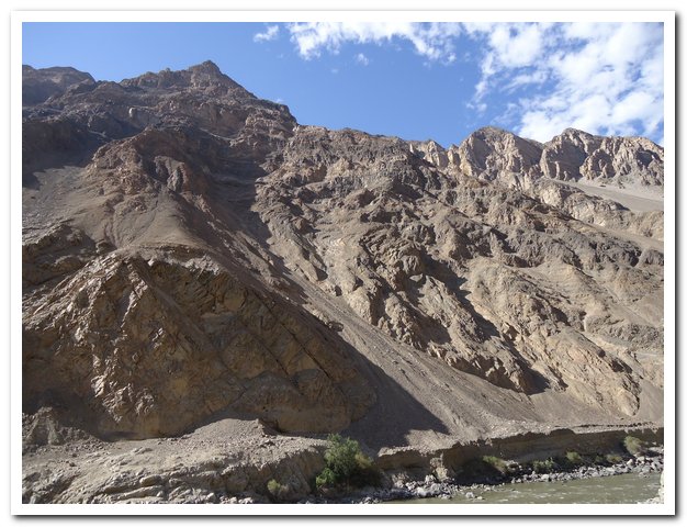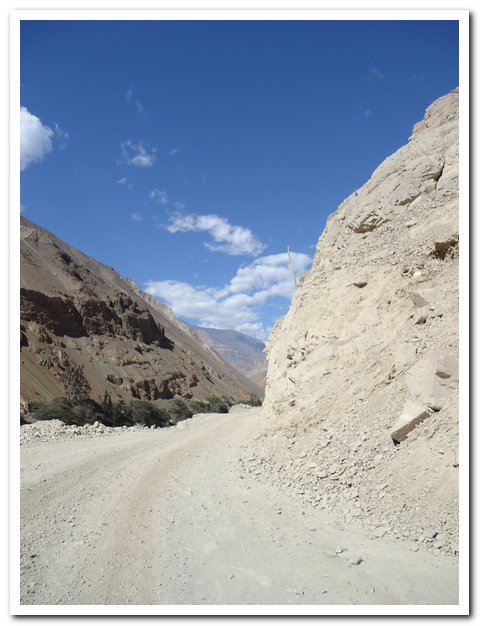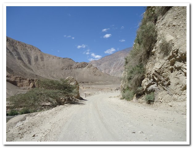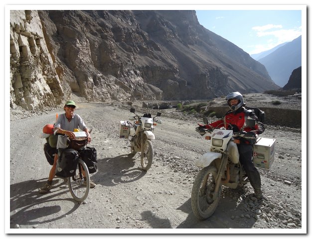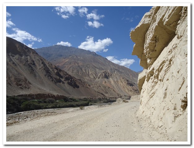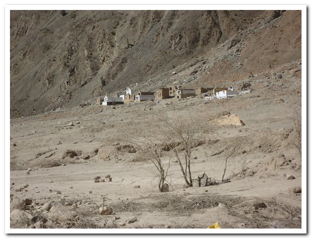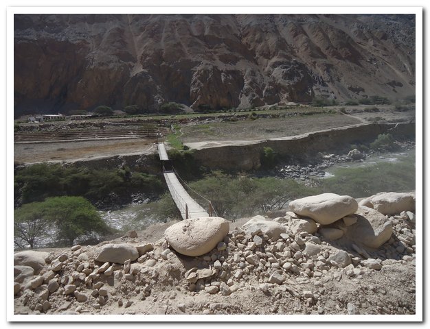 • Je rencontre Daniel et Anne, Daniel termine son tour du monde entamé il y a près de 4 ans, Anne l’a rejoint pour les deux derniers mois, tout de suite nous reconnaissons et sommes très « en phase », cette rencontre va bouleverser ma journée… A 8 heures je suis prête à partir quand surgit Anne, je ne partirai qu’à 9 heures, ils me doubleront, je piqueniquerai avant l’heure, je les retrouverai à l’unique restaurant du parcours (d’ailleurs en dehors de ce restaurant il n’y a rien), je manque de prudence en allant leur faire coucou et me fait voler mon appareil photo, je « perds » donc beaucoup de temps (mais ai tellement gagné de les connaître) et je vais me faire piéger dans le canyon del Pato et rouler jusqu’à 19 heures avant de trouver un endroit où planter ma tente. Trois fois on me proposera de m’emmener plus loin, trois fois je refuserai « tout en bicyclette ». Avant un tunnel deux trous dans le rocher j’ai failli m’arrêter là, un trou pour mon vélo, l’autre pour moi, en dehors de ça rien, à gauche le rio, à droite des falaises si hautes qu’on n’en voit pas la cime. Rouler de nuit (enfin je pousse, là je roule pas) dans le canyon del Pato, coté ambiance ça donne… J’ai quand même un éclairage (que je te recommande Jean_Luc, les minuscules lampes de décathlon, blanche devant, rouge derrière, en plus elles fonctionnent avec les piles plates universelles, les mêmes que celle du compteur, et pour après-demain indispensables, mais chut je ne vais pas tout révéler d’avance…) Daniel, lui, a plus d’expérience que moi et aussi il est plus grand, il verra donc l’unique maison et l’unique replat en contre-bas où planter sa tente avant la nuit. Moi je vais la planter à coté d’une « fruteria », dix cabanes qui vendent des fruits, j’essaie de trouver de la bière, bin oui c’est mon anniversaire, hélas ils sont tous adventices et l’alcool est prohibé… Au restaurant des sanitaires avec douche, l’eau est pompée dans le rio et n’est pas glaciale, j’en profite, ça ne sert à rien, je dors dans le charbon… Pas d’électricité, les étoiles scintillent de mille feux… Quand au canyon del Pato dans lequel je suis totalement immergée, indescriptible… Impressionnant, de chaque coté des murs de 1500 mètres de haut… Et la route elle est redevenue piste, snif, snif… Au passage jean-Luc si tu lis ces quelques lignes, c’est le passage obligé de tous les cyclotouristes qui mettent le pied au Pérou, même les cyclotourdumondistes y passent, alors ne le loupe pas, la piste est bonne.