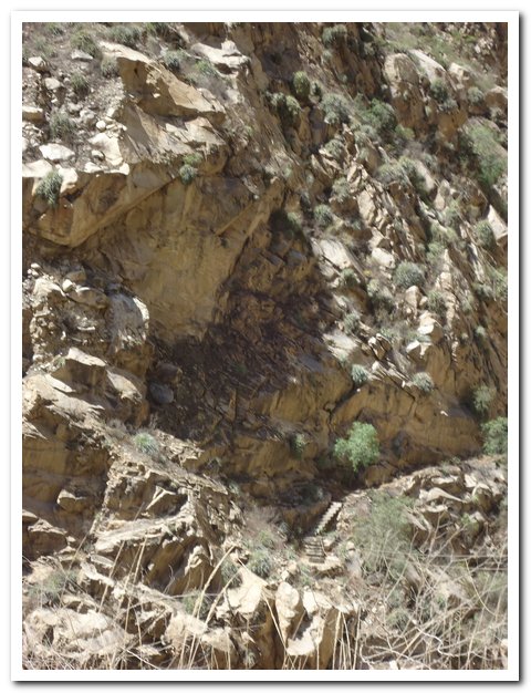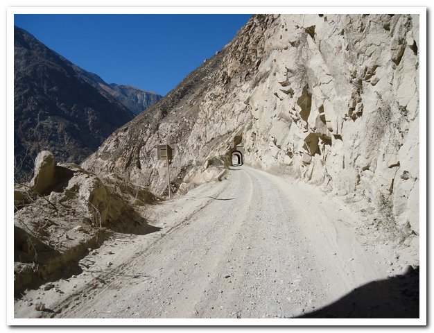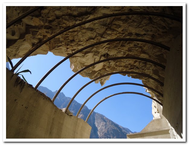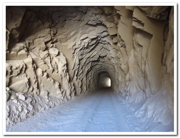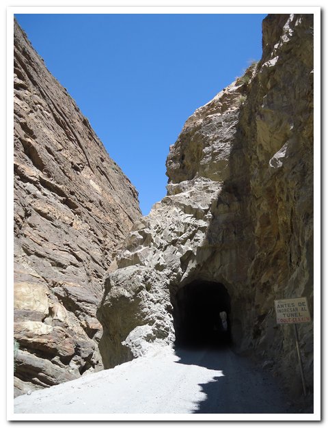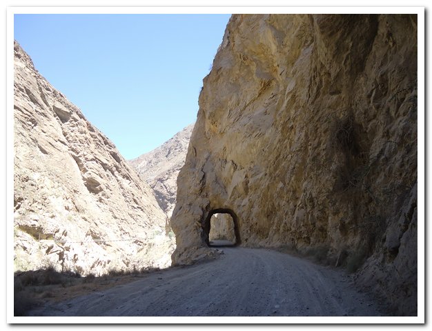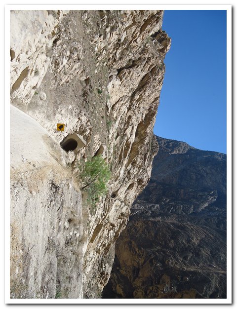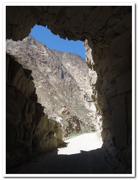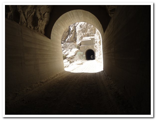 Le canyon s’est rétréci, c’est impressionnant, la piste est étroite, aérienne et va remonter le canyon dont les parois s’élèvent à plus de 1000 mètres. Trente cinq tunnels vont émailler le parcours, certains nécessitent de mettre mon éclairage (ce que je fais, je suis prudente)…