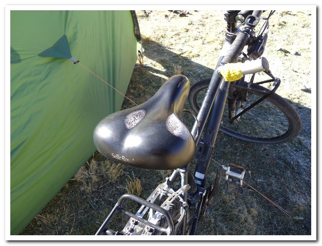 La nuit fut moyenne : le vent souffle très fort et la toile de tente claque très fort, finalement je me lève, replante bien tout, ça va mieux. Puis le froid va me réveiller plusieurs fois, c’est mon échafaudage de polaires qui s’est écroulé. A 3 heures du matin je suis bien réveillée, je me suis endormie vers 19 heures hier, je n’étais pas bien, j’ai faim je déjeune et me rendors, je me réveille au lever du jour, tout est blanc dehors, j’attends un peu, non le soleil, on m’a dit qu’il ne serait là qu’à 8h30, juste j’attends d’avoir le courage de me préparer dans le froid et dégivrere ma selle avant de m’y seoir…