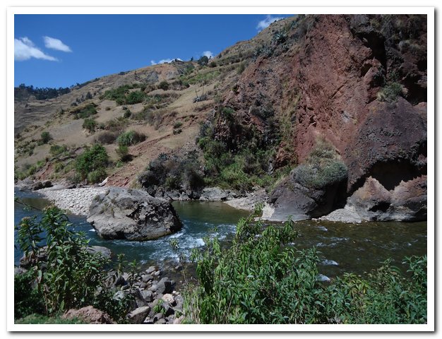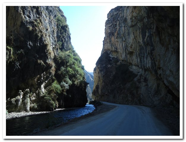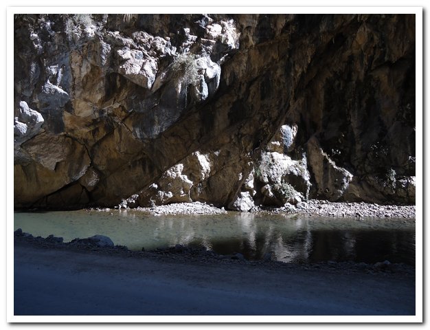 Surprise à la sortie du village je perds la route pour trouver une piste, mais une piste en excellent état (terre battue, ça vaut le goudron et quand la piste est mauvaise (cailloux, gravier, sable), ce n’est pas trop gênant car la pente n’est pas trop forte, il fait beau, un peu froid, le paysage est grandiose et ça descend, que demander de plus ? La route descend le rio, va serpenter dans des gorges somptueuses…