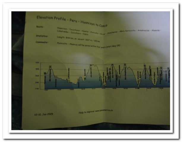 Je retrace, je me découvre un peu, pas trop car à la vitesse où je vais je sens l’air frais, et rigolez pas, c’est vrai. J’arrive à Huancayo qui est une très grande ville. Pour commencer il faut sortir du rio, donc monter. La ville bien sud-américaine est encombrée de voitures bruyantes et tueuses, je suis prudente, mais bon… De traçage en prudentisme je me retrouve à la sortie de la ville dans la bonne direction en ayant loupé le centre. Je me cherche un hôtel dans les parages, je le trouve, il est très minable mais la chambre a une grande baie vitrée par laquelle on ne voit d’ailleurs rien mais la chambre est chaude. Je prends. La douche est glaciale et je me lave les cheveux car vraiment je ne ressemblais plus à rien, je fais aussi ma lessive, donc je me paralyse de froid. Quand je vais sur la terrasse pour pendre mon linge, je renonce à escalader l’échelle bringuebalante. Ayant raté le centre, me disant que peut-être il n’y a pas de centre j’hésite à rester ici un jour comme prévu, et puis le soir je vais trouver un internet qui marche et où les machines diffusent une douche chaleur, je reste, espérant un jour arriver à mettre mon site à jour.