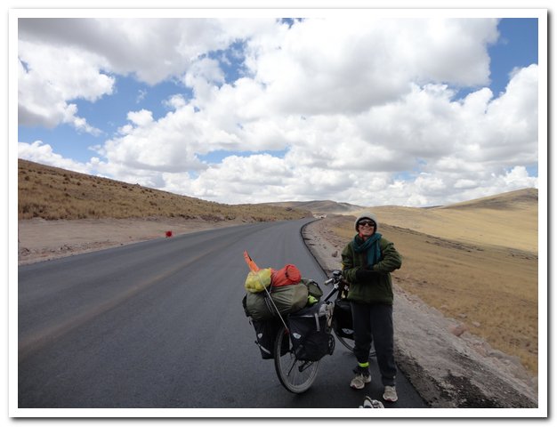 Nous arrivons dans une zone de travaux. je suis derrière un enfin je ne sais quoi, impossible à distinguer vu le nuage de poussière qu’il dégage, il se met à reculer, je suis obligée de le doubler, complètement à l’aveugle, je n’y vois pas à 10cm, j’ai de la chance, rien en face… De la poussière on va en bouffer, je ne sais pas que le lendemain je vais la manger… Je sens que je me mets dans le rouge question muscles, de plus il se fait tard. A un endroit des péruviens campent, ils font dessiquer des pommes de terre au soleil et dans l’air hypersec qui règne à cette altitude (j’ai vu un reportage à la télé sur ça, alors je sais, c’est une sorte de pommes de terre, c’est une technique ancestrale et il faut des conditions d’ensoleillement, de sécheresse de l’air qui ne doit exister qu’à cette altitude), si j’avais été seule je pense que j’aurais demandé la permission de camper avec eux, mais il y a également une odeur qui me dérange… Et je suis avec Christophe, je passe.