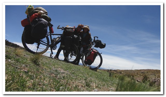 D’abord le plus bel oiseau libre du monde, elle a dix ans de moins que moi mais est tellement plus libre… J’espère, arrivée à Ushuaïa, avoir acquis un peu de sa liberté… Ni GPS, ni téléphone (remarquez moi-aussi), ni carte, ni ordinateur, pas même d’appareil photo… Elle est partie il y a cinq mois du Paraguay, va de-ci delà, explorant au grès de sa fantaisie les chemins de traverse, parfois elle ne fera que10 km dans la journée, s’arrêtant quand elle le veut et où elle le veut, les bivouacs sauvages loin de tout ne l’inquiètent pas, même ses cheveux elle les a laissé libres… Revêtue d’une robe de laine elle a je crois trouvé la solution pour ne pas avoir les cuisses glacées comme je les ai souvent… Nos points communs ? On a un buen suerte de crevaison, chacune une, oué car moi je mets deux heures pour changer une chambre à air, elle trois… Nous avons toutes les deux la moitié d’une sacoche pleine de trucs pour réparer le vélo, oh on a pas décidé d’emmener ces trucs, juste qu’on a peur pour nous alors on nous donne des démonte-chaines, des câbles, des trucs pour changer intégralement tous les rayons, même qu’on nous a montré, même qu’on sait qu’on le fera jamais et un jour, en catimini, on va prendre tout le sac et on va le jeter dans un fossé… Elle et moi sommes minuscules… Elle et moi avons perdu 10kg, ne vous inquiétez pas là je suis en train de reprendre… Notre joie rebondit de l’une à l’autre… Notre rencontre a lieu à 10 mètres du col, elle a faim, j’ai froid, nous nous quittons…
