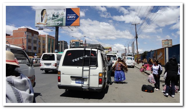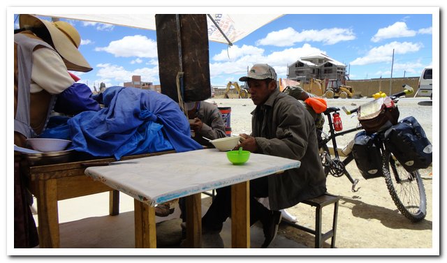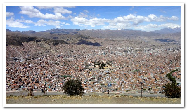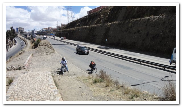 Conditions météorologiques : beau temps, vent glacial par moments Particularités de la journée : je traverse un altiplano, puis une banlieue sur l’altiplano, puis descente vertigineuse de 500 mètres de dénivelée sur autoroute sur la Paz, ville étonnante…