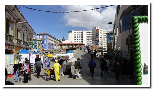 J’arrive dans le centre ville ultramoderne de la Paz, je demande mon chemin et là je vais galérer, les gens ne se rendent pas compte, mais avec un vélo chargé on ne peut franchir les escaliers… La Paz a cette particularité de ne rien avoir de plat, une grande avenue suit le rio qui est maintenant souterrain (et qui évidemment l’an dernier a resurgit, inondant la grande avenue…), là se trouvent les quartiers modernes.