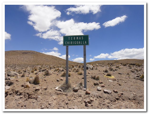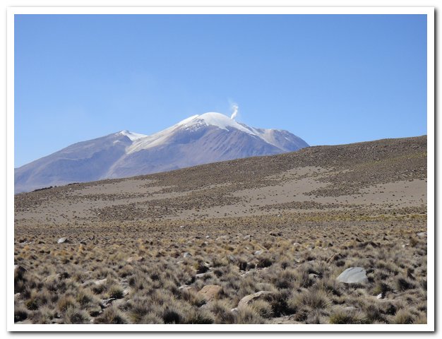 Dans ma tête je suis partie pour remonter à 4660 m, à la vraie frontière pour prendre la piste à 10 mètres comme indiqué et en passant devant le poste frontière bolivien je vois un écriteau « Guallatire », je ne réfléchis pas une seconde et m’y engouffre, après je vais regretter longtemps de m’être précipitée et de ne pas avoir demandé plus amples renseignements. Il n’empêche sur ma carte c’est la bonne piste. Toute la journée je vais avoir les yeux sur le volcan, ma carte et ma boussole… Une demi-heure après le départ je vois les carabinieri, je les rassure sur mon sort, ne pense pas à leur faire confirmer ma route.