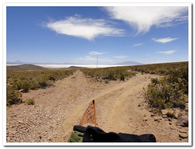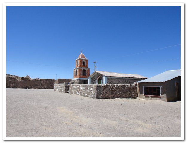 Je me fais préciser mon chemin, je peux soit faire le tour et passer par le salar, soit prendre la route à gauche (pour Enzo pour qu’il me situe, sur la place de ce que j’ai cru être Tres Cruces, à droite l’église, à gauche le chemin où on m’envoie).