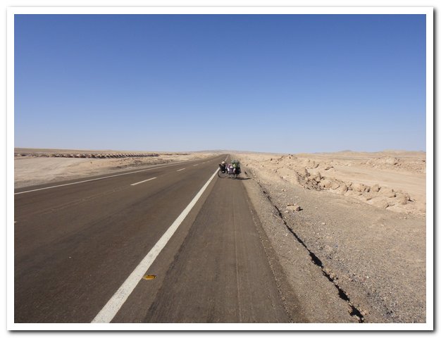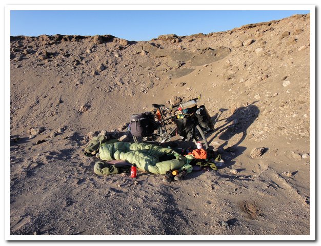 Je fais deux arrêts pique-nique, puis je repédale, chaque jour du désert j’engage une course contre la montre, plus je vais vite, plus je gagne du temps sur le vent, plus je gagne du temps sur le vent, plus je vais vite, plus je vais vite, plus les kilomètres tombent, plus les kilomètres tombent moins j’ai d’eau à charier, moins j’ai d’eau à charier, plus je vais vite, oué, c’est simple, suffisait d’y penser…