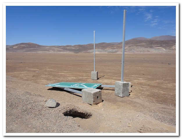 Je monte ma tente sur une piste parallèle à la route, me disant qu’il faudrait être taré pour l’emprunter… La route ne m’abrite pas, le vent n’est pas trop fort, je ne me méfie pas, j’installe la tente en mettant juste une sacoche dedans… Horreur tout d’un coup le vent se lève, traîne ma tente sur plusieurs mètres, les dégats sont épouvantables : trois trous dans le double toit, un dans la tente intérieure, un sur le tapis de sol…