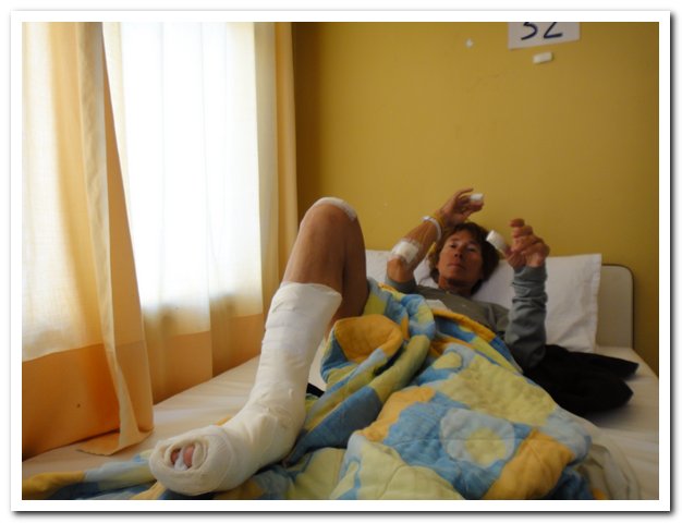 A l’hôpital de Taltal elle est rapidement prise en charge, radio, le diagnostic tome : fracture avec déplacement de P1 du gros orteil droit, ce n’est pas de leur compétence, elle sera transféré demin à Antofagosta. Ses plaies sont nettoyées, pansées, le pied est immobilisé dans une botte platrée. La cyclo est mise dans le service de femmes (une chambre à six lits) et là va commencer un cauchemar de deux jours : pas à manger, pas de couvert, pas de verre, pas d’eau, pas de sonnette pour appeler l’infirmière, pas d’affaires de toilette, de toutes façons toilettes inaccessibles, pas de bassin, rien. La cyclon’a aucun moyen d’appeler, pas de téléphone, pas d’internet et elle ne peut se déplacer, bref elle est épave… Heureusement ses compagnes de chambre et leur famille vont lui porter secours. L’une ira chez elle et luiramènera à manger, des couverts, un verre, l’autre lui donnera un soda, la troisième de l’eau, une autre l’emmènera aux toilettes.