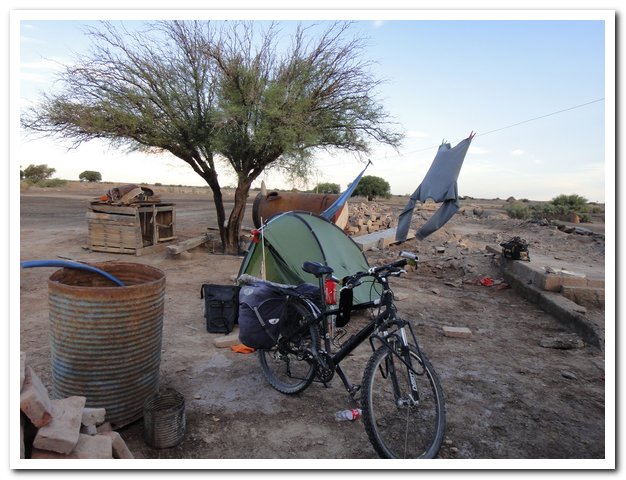 Je vais me coucher, il fait atrocement chaud. Ici pas de rosée m’ont-ils dit, je laisse la tente ouverte, deux sacoches sont sur le vélo, deux à l’entrée de la tente. Je suis déjà couchée, ils viennent me proposer de la soupe, je refuse, je sens que je les gène, et puis je me suis bourrée de galettes. Je vais les entendre jusque tard dans la nuit, l’un va chanter puis comme raconter des poèmes ou des légendes. Visiblement ces deux jeunes dans leur dénuement sont heureux de la vie qu’ils mènent… Mais eux-aussi pas spécialistes de la météo, l’orage n’est pas pour ici. Je m’endors très tard. Dans la nuit je me réveille, le ciel est super étoilé, une heure après c’est l’apocalypse. Un petit vent qui va rapidement devenir complètement dingue, je ne peux maintenir la tente de mon seul poids, elle est juste amarrée par des briques, je rapatrie les sacoches à l’intérieur, ça ne suffit pas, d’une main je m’habille, la très mauvaise idée de continuer à dormir dans a tenue d’Eve, de l’autre je tiens la tente, et je comprends que ça ne suffit pas, alors je fais tomber les arceaux et la plaque au sol, la grêle tombe, les éclairs fusent, le tonnerre gronde. Les jeunes sortent et me disent qu’il faut rentrer le vélo, je demande si ils n’ont pas un lit pour moi. Si ils ont. A deux on porte la tente remplie de mes affaires et de deux sacoches. Je suis en sandale. Je ne vois pas une aspérité du sol, à nouveau je m’explose, que des égratignures, le genou, un orteil (encore), le coude. En trois minutes toutes les ouvertures de la maison sont fermées par des planches carrément clouées et je vais dormir douillettement dans un lit défoncé, et ce jusque 9 heures…