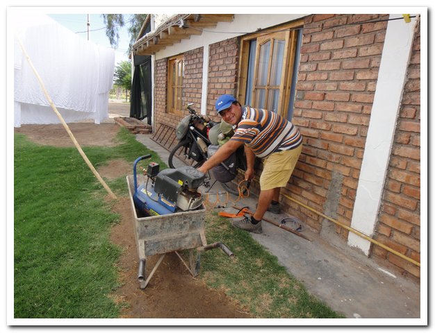 Avant de partir le voisin et cousin de ma propriétaire emploie les grands moyens pour regonffler mes pneux.