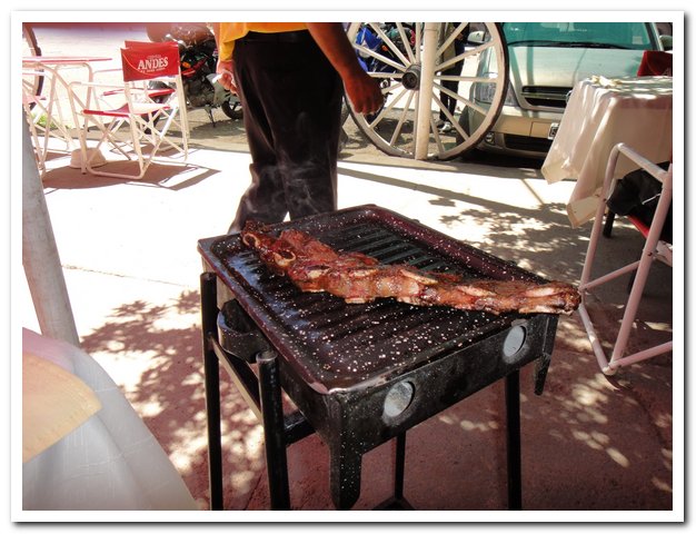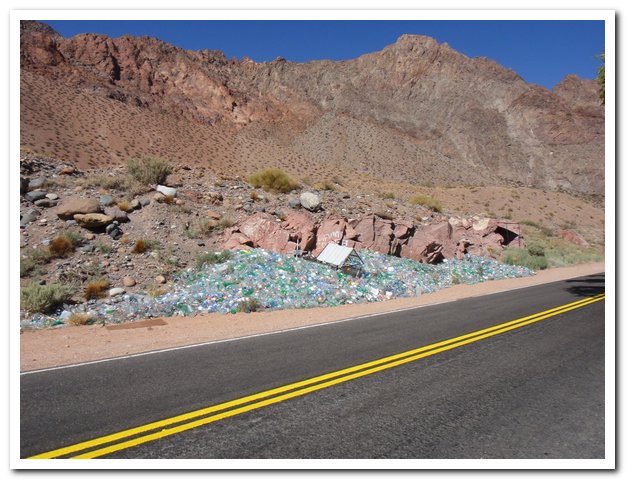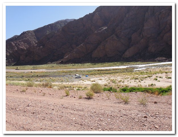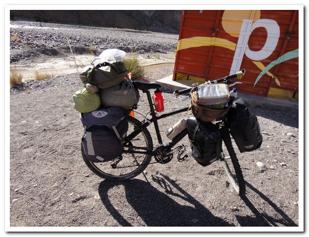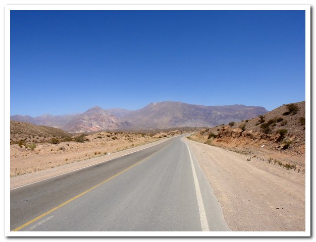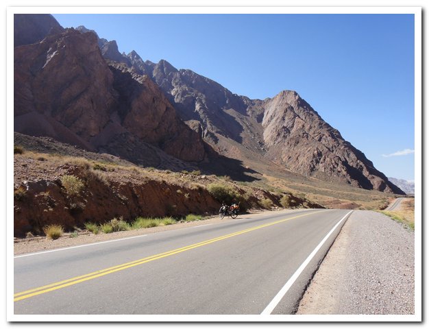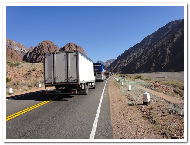 Et la route ? Excellente, elle monte et descend, j’ai ma petite heure de tranquillité (pendant la sieste des argentins) puis la valse des camions et voitures recommencent… Je descends lentement car le souffle des camions en sens inverse me chahutent. C’est dur quand même cette circulation, et au moment où j’écris c’est le bruit, car le plus gros du trafic international a lieu de nuit… Si ça continue je transforme mon vélo en pédalo et je passe par la mer…