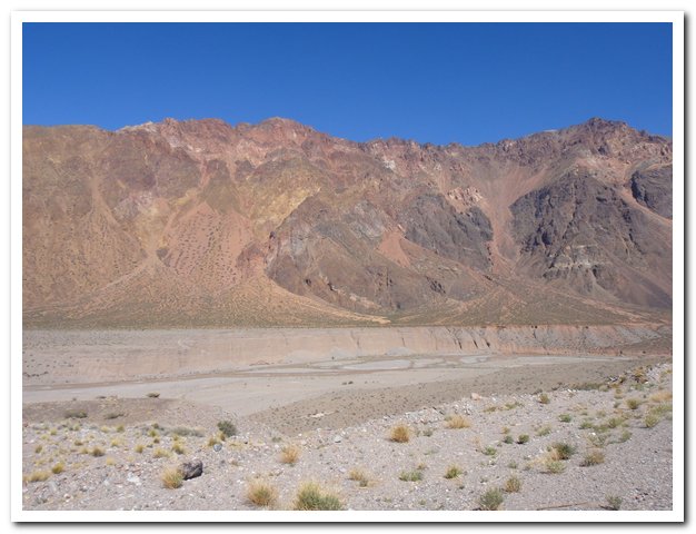 pays, donc ils savent mieux que nous, ils prononcent oussouaia), je ne m’arrête pas non plus aux premières cabanas sur la gauche à l’entrée du village, parce que si je m’arrête là, ce n’est pas une semaine mais un mois de repos que je prends… Uspallata est une oasis de verdure et n’est faite que de restaurants, hôtel et cabanas. Comme annoncé par le ministère du tourisme il y a bien un distributeur de billets qui accepte de me fournir en pesos argentins, quand je passerai de nouveau la frontière (parce que mon avenir c’est ça, un coup Chili, un coup Argentine et je recommence) j’aurai des sous.