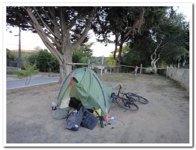 Et puis au Chili il n’y a pas toujours hôtel ou pension dans les villages, la nature étant barbelifiée, la cyclo elle a décidé de planter sa tente au milieu du village,