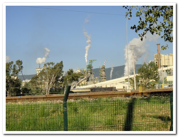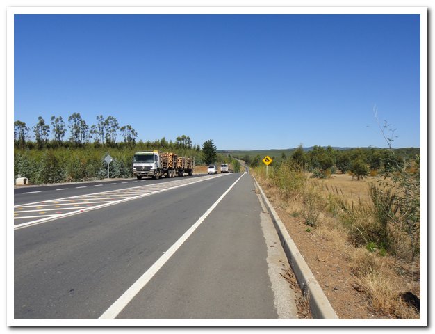 en totale insécurité, ce d’autant plus que vient de réapparaître les camions tueurs, vous savez ces camions qui déplacent un grand volume d’air, comme celui qui m’a mise par terre, et qui (comme les bus d’ailleurs) ne dévient pas d’1mm leur trajectoire pour une pauvre cyclotouriste… Ces camions tueurs en plus sont vides, donc ils vont à fond les manettes… Je me demande bien d’ailleurs ce que Nacimiento peut bien avaler comme ça. Dans la banlieue de Nacimiento deux immenses usines de cellulose, de fabrication de papier quoi.