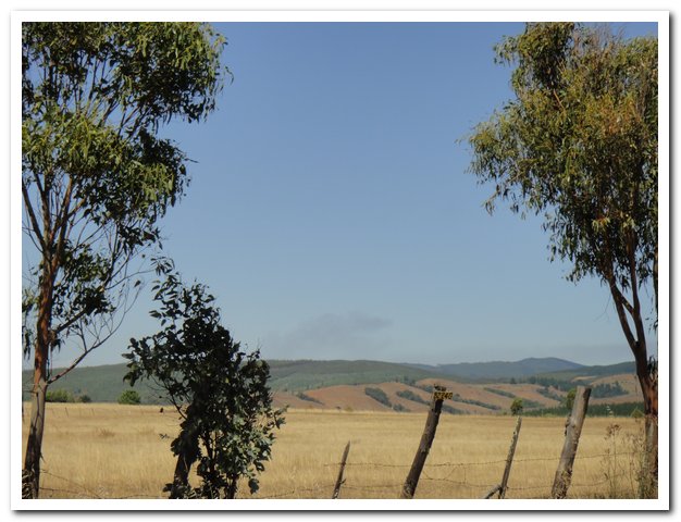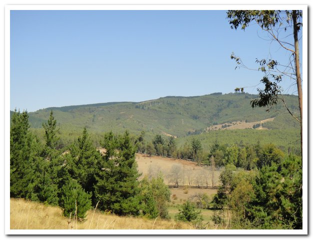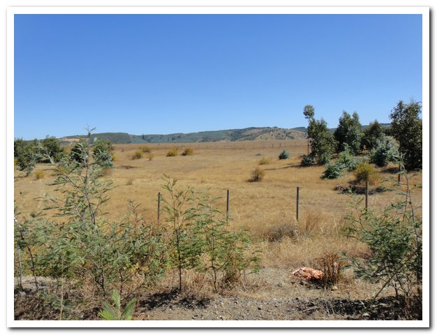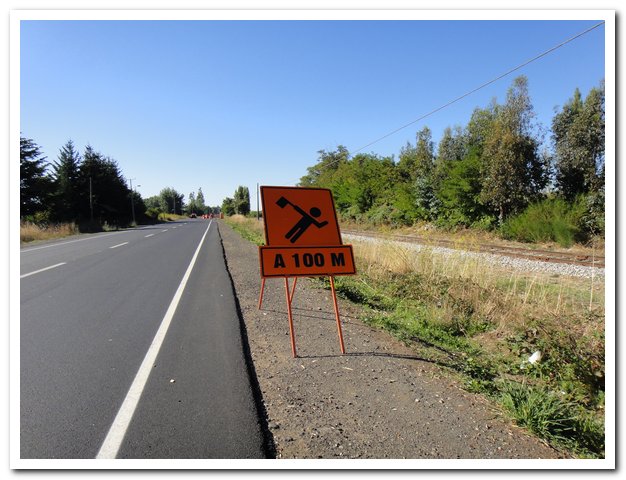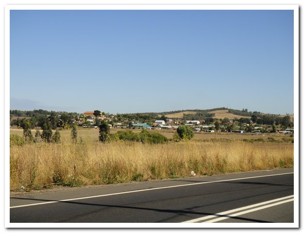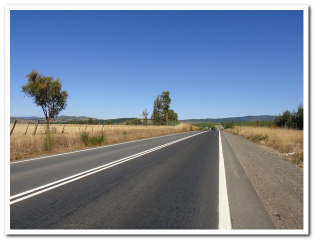 Au km 42 de ma journée, à la bifurcation pour Angol et au troisième accès à la ruta 5, enfin la circulation va se calmer, je pense qu’un tiers va sur la ruta 5, laquelle ne va pas en recracher d’autre, un tiers va sur Angol, et je garde le reste, donc là ça devient supportable… La route reprend alors son cours normal, repartant dans les collines, montant et descendant.