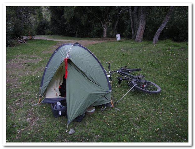 C’était donc ma nuit, avant la nuit il y a eu la soirée, toute la journée j’ai forcé pour essayer d’atteindre le Lago Verde où il y a un camping organisé et je l’ai atteins, mais surprise il est au fond d’un ravin, je vais inspecter à pied, c’est une heure de poussage-torture pour le lendemain, non merci… De l’autre coté de la route il y a ce que je prends pour un camping fermé, la chaine du portail est juste posée sans cadenas, j’inspecte les lieux, ce n’est pas un camping mais un parc à bestiaux. Je décide donc de planter ma tente dans une clairière où j’espère avoir le soleil de bonne heure le matin, de plus je suis à l’abri du vent, en revanche n’étant pas dans un lieu de camping autorisé je m’abstiens de faire du feu, je comptais aussi sur l’eau du camping de Lago Verde, je suis très juste en eau, mais ça va passer, l’eau de cuisson des pâtes sera délicieuse aromatisée de