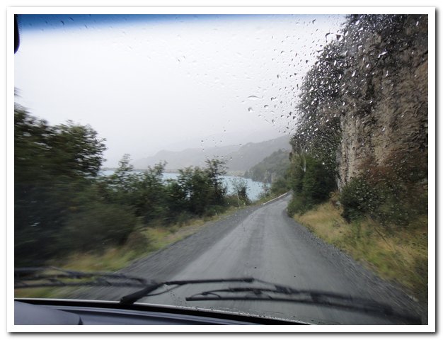 Un premier véhicule me voyant sctochée sur la route m’attend, je ne fais aucun signe, il continue sa route, un deuxième fait de même, je résite encore… Un bulledozerpelleteuse a pitié de moi, il avance en crabe pour me fair un cone sans vent, je gravis ainsi une pente (inutile de dire que je pousse), la scène est si pitoyable qu’il vaut mieux en rire… Un minibus s’arrête et me propose de m’emmener, je craque… Soit-disant que ce vent n’est pas normal, il dit qu’il va me déposer à Puerto Rio Tranquillo…