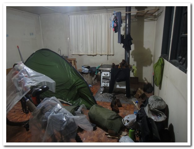 Je frappe à la porte d’une maison où je vois de la lumière, une femme entrouvre à peine sa porte puis va m’ouvrir grand son cœur, elle s’appelle Alexandra, a 44 ans et une vie difficile aussi… Elle a vécu quelque temps en France avec un ami qu’elle a fui car violent, il y a 4 ans elle a vécu un grand amour avec un homme plus âgé qu’elle de 20 ans, il y a 6 mois Pablo est mort d’un cancer généralisé, elle va m’offrir tout, de la chaleur, à manger et son amitié. Elle est professeur à l’école de l’estancia. L’estancia était auparavant une ferme, elle est maintenant transformée en parc naturel et tenez-vous bien le propriétaire est un riche américain qui a fait une fondation, beaucoup de parc au Chili sont ainsi entre les mains des américains, ne croyant nullement à la misanthropie de ceux-ci, pensant sérieusement que l’hôtel à 200 dollars la nuit n’est pas rentable, je me pose des questions : impérialisme ?  Une manière d’échapper à l’impôt ? Voire blanchiment d’argent sale… Quoiqu’il en soit je réfute l’hôtel à 200 dollars et échoue (c’est le cas de le dire) dans une baraque de chantier, il faut que je libère les lieux demain matin…
