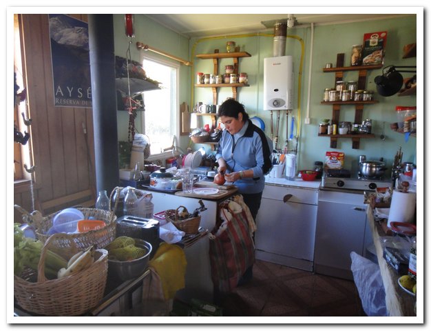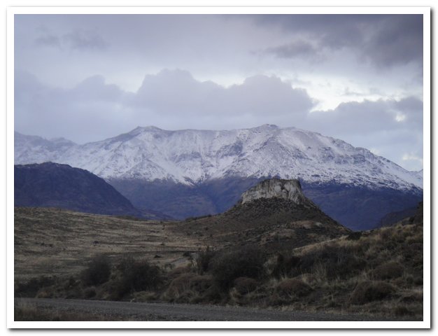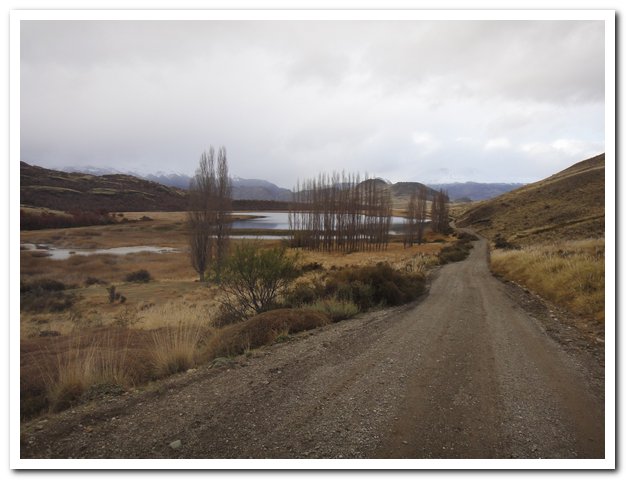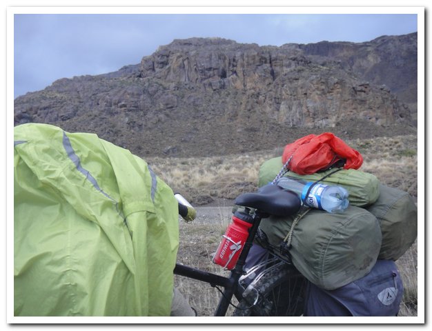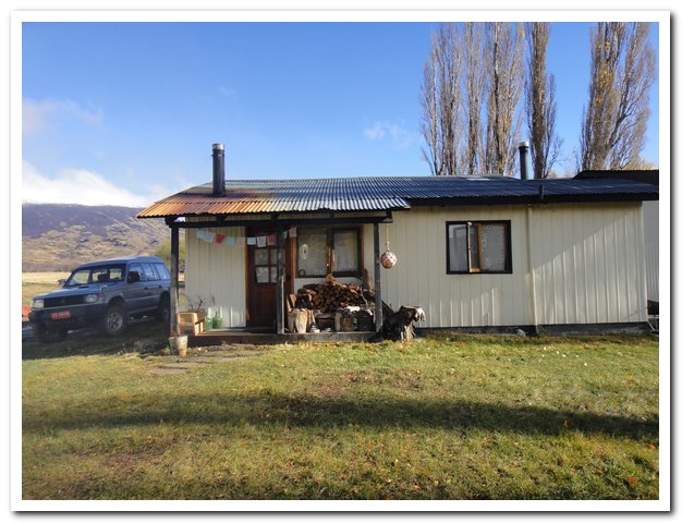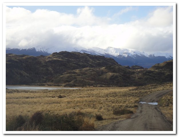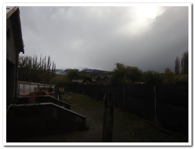 Hier j’étais dans un état lamentable, trempée, transie, le moral au plus bas, je me dis que toutes les prédictions funestes sont en train de se réaliser, tu ne passeras pas, la Patagonie en hiver, non mais tu n’y penses pas, le vent, le froid, la neige… Si tous les oiseaux de mauvais augure pouvaient arrêter de me saper le moral ce serait pas mal… Sachez oiseaux de mauvais augure que je vous hais… Donc dans cet état de décrépitude avancé je me dis qu’il faut que je trouve une solution, la météo est exécrable pour les cinq jours à venir, que faire ? Dago qui régit cette estancia et qui aurait bien aimé me louer une chambre à 200 dollars ou une place de camping à je ne sais combien de dollars et qui m’a prêté cette cabane de chantier à condition que je dégage le matin, Dago m’avait promis de m’emmener en véhicule à la frontière à 60 km de là, oui parce que passer le paso à cette période, le vent, le froid, la neige… Rendez-vous est dons pris pour après l’almuerzo (le repas de midi); je passe la matinée à nettoyer mon vélo et faire sécher mes affaires en faisant du feu, ce qui n’est pas chose aisée car pour le bois je dois traverser un champ de boue et trouver au milieu d’énormes troncs quelques petits bouts de bois humides, mais bon, j’y arrive, et puis j’ai bien dormi au sec, et puis Alexandra m’a regonflée de son énergie. Toute la nuit il a plu, la veille au soir il neigeait même, un vent glacial aussi soufflait… Et puis en fin de matinée une éclaircie… Quand je vois Dago pour savoir à quelle heure il m’emmène, et bien il ne m’emmène plus et pour la cabane il en a besoin… Je décide donc de partir, mais avant j’ai rendez-vous avec Alexandra pour déjeuner, nous allons à nouveau passer un moment délicieux ensemble, il n’y a pas, le courant passe entre nous deux, et nous nous quitterons avec des larmes dans les yeux…