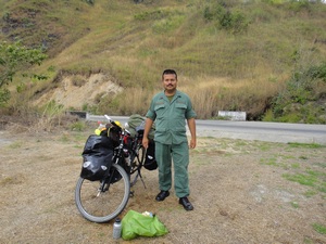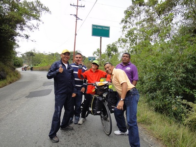 Hier soir la personne qui servait à manger dans un mauvais fastfood allemand (et cher) m’avait dit qu’il y avait 27 km pour rejoindre La Victoria (ville où je voulais régler mes problèmes de téléphone) et là j’étais bien, hésitais à me reposer et remplir mon blog de mon baratin et mettre des photos et remercier tous ceux connus ou inconnus qui m’encouragent, donc j’hésitais… en parlant avec la réceptionniste (malgré mes problèmes de maîtrise du vénézuelien continue à parler) j’apprends que si je pars je dois le faire à 11 heures et qu’elle a trouvé quelqu’un pour changer mes euros. Je suis bien là, mais n’aime pas cet endroit un peu bizarre où je ne sais plus où je suis : en Allemagne ou au Venezuela. En tous cas ils perlent une drôle de langue, et visiblement il y a des descendants des anciens colons allemands. Au bout d’un moment j’en ai marre de taper sur l’ordinateur et me décide à partir pour une petite promenade de santé, vite je range mon bazar que je sais si bien mettre, je récupère le linge qui a séché au soleil sur le balcon, je change mes euros, la personne me propose de m’emmener, réexplique que ce n’est pas mon choix. décolle à 11H 15, quand je dis que je décolle, c’est un euphémisme, commence par pousser difficilement encore une pente qui avoisine les 30 ou 40%, je pousse sur 10 mètres, je respire, je pousse et cela pendant 2 km, même certaines voitures doivent s’y reprendre à 2 fois pour réussir à grimper. Je pense à la sortie du village à me ravitailler en boisson de réhydratation et chocolat. Les nuages évidemment ont obscurci le ciel et voilent les sommets. Puis c’est 5 km de montée poussable ou parfois roulable (jamais plus de 50 mètres à la fois). Il commence à faire froid, je m’habille, lors d’un habillage le vélo se déséquilibre (les endroits plats n’existent pas ici) et la pédale me rentre dans la cheville, j’ai franchement mal, suis un peu inquiète, mais ça saigne pas et finalement ça va. Je commence à être franchement dans le brouillard et puis le sommet et les cris de joie et de victoire pour tous, même ceux montés en voiture… Le paysage a changé, la forêt équatoriale, puis les cultures (beaucoup de fraises) ont laissé place à des montagnes dénudées et austères et toujours aussi emberlifoquées dans tous les sens. Je suis sur une route touristique, on est samedi, il y a des touristes (et oui les vénézueliens font aussi du tourisme, font pas que tuer les estrangers…),  je vois même deux parapentes, j’ai franchement froid, me couvre un peu plus et décide de manger plus bas quand il fera meilleur. Finalement je mange sur un coin d’herbe à coté du poste de contrôle, tranquilos, tranquilos car je ne sais pas ce qui m’attend… La descente était hard, là elle devient duraille de chez duraille, suis souvent en position debout, bien positionnée à l’arrière de mon vélo car la route est toujours à plus de 20% de pente, les virages sont hyper-serrés, et la route est cassée, ne peux répondre aux encouragements des voitures qui me doublent, suis beaucoup trop concentrée, régulièrement je m’arrête, histoire de reprendre mes esprits et de laisser refroidir mes tocos (mes freins), je regrette finalement de n’avoir pris qu’un jeu de rechange, car à ce petit jeu-là, mes patins vont vite être usés. Ne peux descendre comme je l’ai appris : freiner, lâcher pour laisser refroidir, là c’est freiner tout le temps, n’ai jamais fait une telle descente, c’est vraiment la descente de la mort… Enfin j’arrive dans la vallée, la température a changé: 38 au lieu de 16 et la route est roulable, c’est un vrai miracle, je ne savais plus ce que c’était…(enfin y a quand même des ponts dangereux) La route est bordée ça et là de boutiques ou fermes, l’endroit a l’air sympathique. A un moment donné je crois avoir dépassé Victoria sans l’avoir vue, non c’est juste que les kilomètres annoncés sont erronés. Me voici dans La Victoria, enfin ce que je crois être La Victoria, suis juste dans une banlieue, mais une banlieue sympa. Me renseigne pour trouver un hôtel ou une posada, au passage je vois que les vénézueliens peignent les arbres de couleur vives, ça me donne des idées… Après les cailloux, le peinture des arbres, heureusement que je ‘ai pas de voisins, sinon ils me tueraient… Mille fois je demande mon chemin, tombe sur magnifique hôtel, mais trop cher, la réceptionniste me donne deux noms, je cherche, traverse cette fois-ci le centre ville, à un feu rouge une femme vient carrément me féliciter et me serrer la main. Puis je traverse une banlieue pourave, suis à moitié rassurée, mais il n’y a aucune agressivité envers moi. Le premier hôtel est complet, le deuxième a des chambres de libre, c’est cher aussi et c’est sinistre. Je demande à changer de chambre, la première proposée puant le tabac. Finalement le réceptionniste me conseille de monter le vélo dans la chambre, ce qu’un sherpa vénézuelien me fait. Je prends rapidement une douche et essaie de trouver la boutique de téléphone, j’arrive, c’est fermé, il est trop tard, retraverse la ville en sens inverse, évite comme me l’a conseillé le réceptionniste la banlieue porave, de toute façon, avec mon sac plastique à la main me fond dans la population locale. J’achète quand même pour demain les boissons de réhydratation, des fois que le dimanche tout soit fermé, j’achète aussi du chocolat. Je mange à l’hôtel prends une « portion »: des frites, des tomates, des cœurs de palmiers (très très bons) et du concombre, sors de table en ayant faim, me venge sur le chocolat dans la chambre, la fin est revenue, c’est bon signe, la turista est partie, merci les remèdes indiens de ma bienfaitrice, en revanche je ne pisse toujours pas, il faut absolument que j’augmente mes rations de boisson